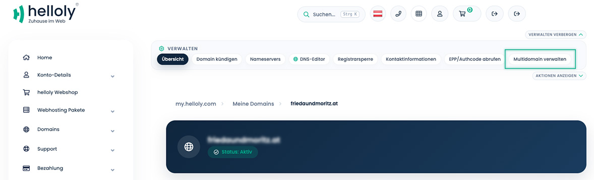 Nun sehen Sie Ihre bestehenden Domains. Bei der Domain, die Sie zu Ihrem Hosting hinzufügen wollen, klicken Sie unter Status auf den Button Aktiv, um Details Ihrer Domain zu verwalten.