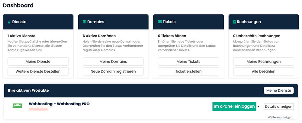 - Select the desired package in the Dashboard area under Your Active Products/Services and click Log in to cPanel