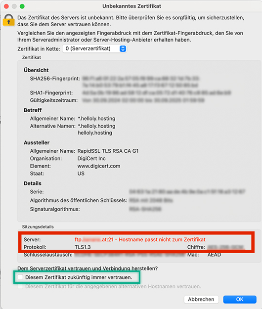 If you connect to your server via an FTP client and receive a warning about an incorrect server certificate, you have two options: