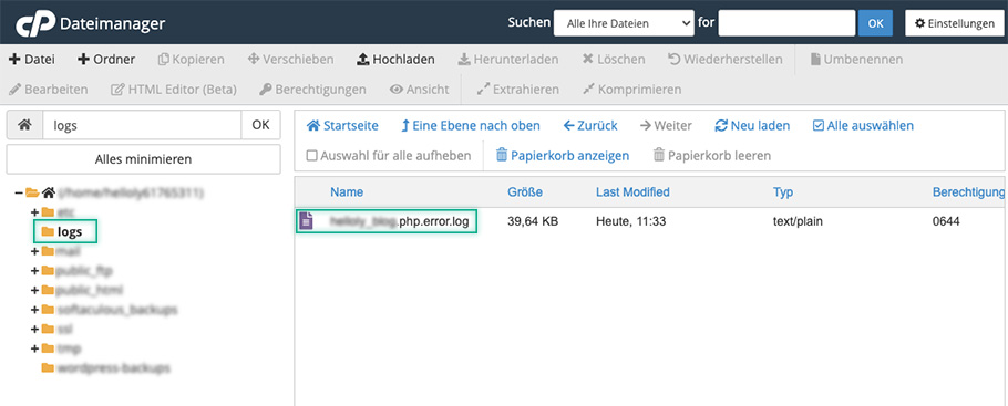 4. Das PHP Error Log (IhreDomain_tld.php.error.log) finden Sie im Ordner logs