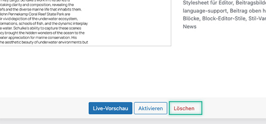 Hinweis: Wenn Sie ihr aktives Theme löschen wird WordPress automatisch ein anderes Theme aktivieren. Sollte kein weiteres Theme verfügbar sein, wird WordPress eine Fehlermeldung auf Ihrer Website anzeigen.