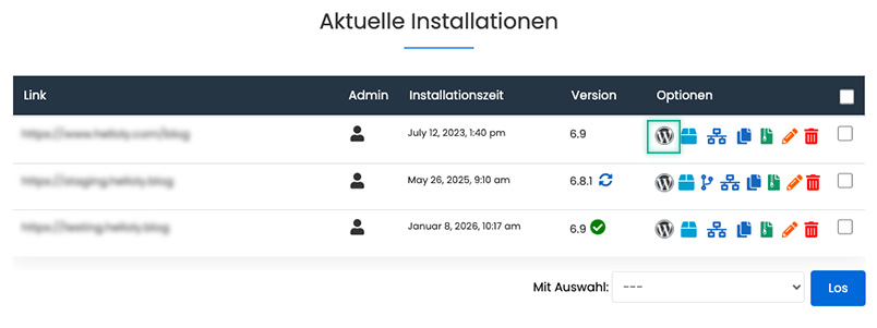 - Klicken Sie unter Aktuelle Installationen neben der gewünschten WordPress Installation auf das WordPress Symbol