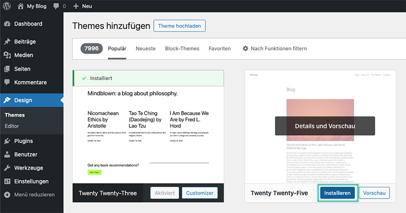 - Fahren Sie mit der Maus über das gewünschte Theme und klicken Sie auf Installieren