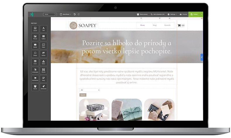 Pomocou nášho používateľsky prívetivého rozhrania drag-and-drop ľahko vytvoríte krásne webové stránky bez akýchkoľvek technických znalostí! Nepotrebujete žiadny ďalší softvér - upravujte svoje webové stránky priamo v prehliadači.